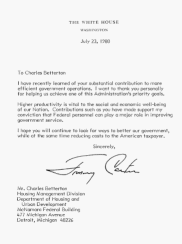 at the same time reducing costs to the American taxpayer. Sincerely, Jimmy Carter |